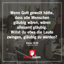 Henning 99; „Und wenn dein Herr gewollt hätte, so würden alle auf der Erde insgesamt gläubig werden. Willst du etwa die Leute zwingen, gläubig zu werden?“